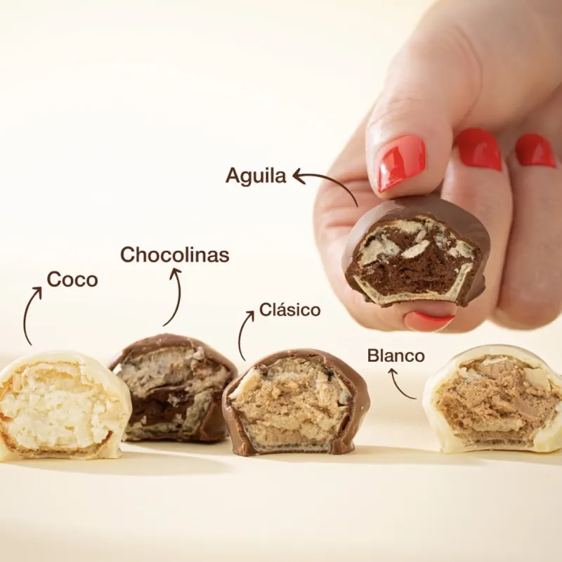 外层是丝滑的牛奶/黑/白巧克力脆皮。 中间包裹着一层酥脆的威化。 最内层有花生酱\榛子酱\椰子\巧克力慕斯夹心,口感层次丰富,甜而不腻。