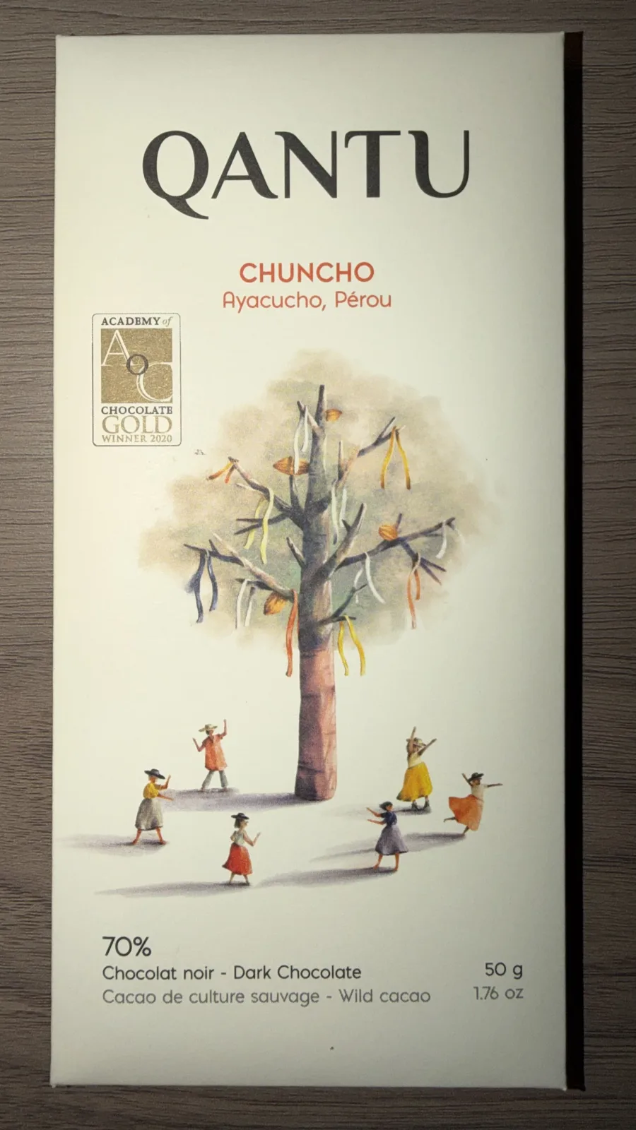 可可豆是来自秘鲁阿亚库乔的野生老藤春丘,每年只收获一次,伴随着当地的嘉年华迎来丰收,是Qantu三大招牌之一。风味极其丰富,包含香料、浆果、坚果、花香、蜜香、树木香等等等等,吃的巧克力越多越能感受到他的魅力。