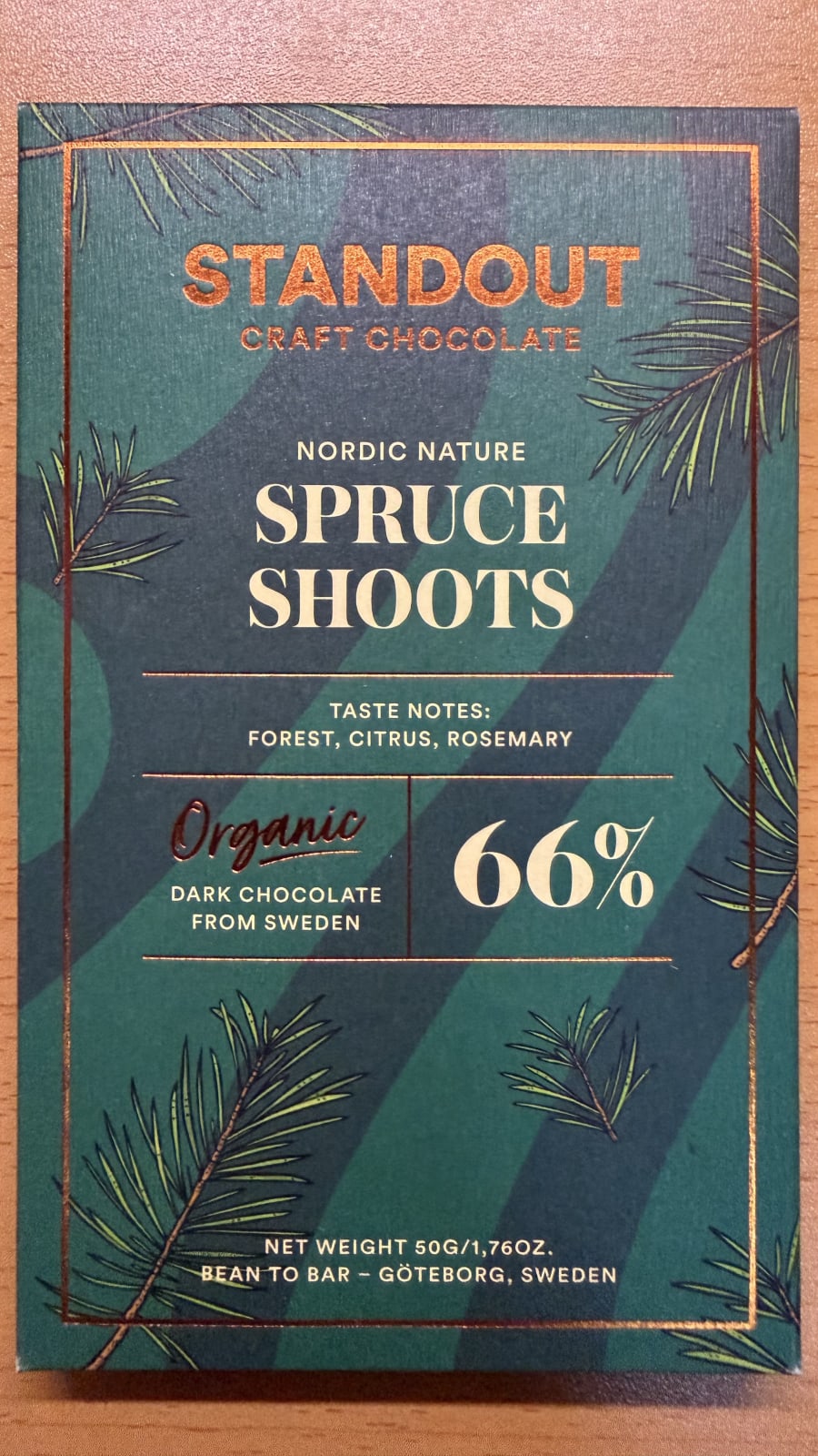 来自尼加拉瓜的可可豆加入从云杉芽提取的松针油。松针的清新,可可的醇厚,然后是类似松针汁水的苦涩感,伴随着发酵酸,整体像是在咀嚼真正的松针
